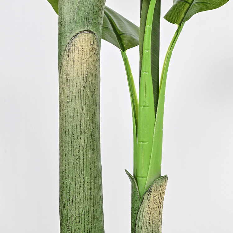 Искусственное банановое дерево изготовлено из прочного материала PEVA.Это очень похоже на поверхность настоящего бананового листа, и поверхность листа такая же гладкая и блестящая, как у настоящего бананового дерева. Оно также использует натуральную кору, чтобы деревья выглядели очень реалистично.Это станет прекрасным пейзажем в интерьере.